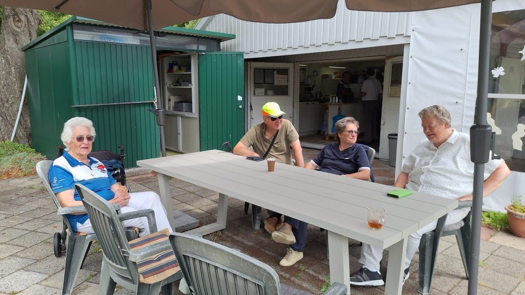 De terrassen waren aangepast voor de vele leden, aangepast in de covidstand, de parasols deden goede dienst, want wat troffen wij het met het weer! Een zonovergoten dag zonder één spatje.
