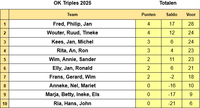 Met mijn welgemeende excuses aan Kees Lansu en Jan Sinnema. Helaas had ik een fout gemaakt bij het invoeren van de uitslagen en heb ik de verkeerde spelers genoemd als winnaars. Kees en Jan zijn 2e geworden, welverdiend met hoge scores. Gefeliciteerd.Ook aan Elly Dolieslager en Paul Klappe mijn oprechte excuses, zij zijn op de 3e plaats belandt. Ida Andreas en Marja Schemmekes, ik schaam mij diep maar we maken het goed met jullie. Een 4e plaats is ook een mooie plek.